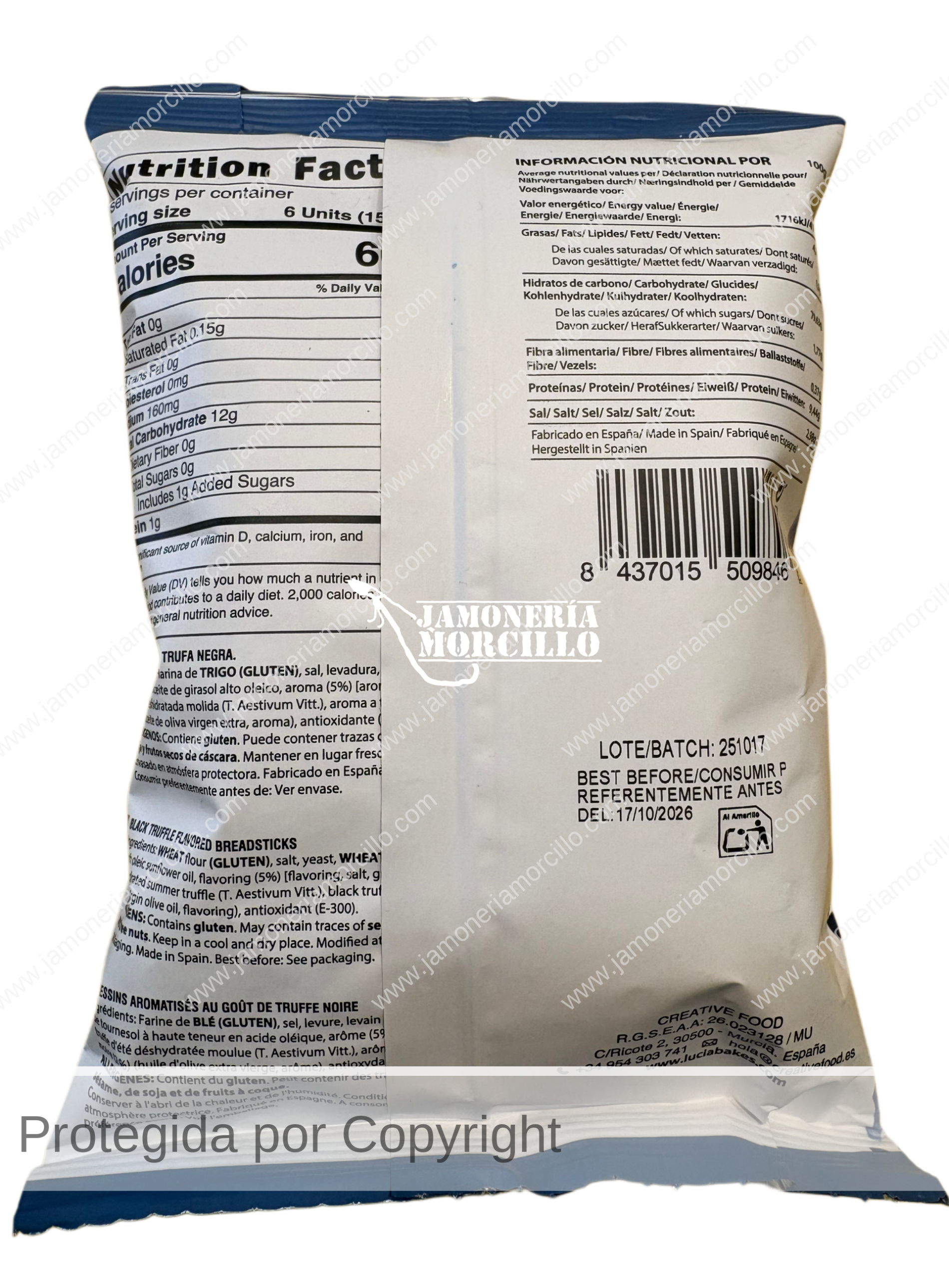 Harina de trigo, agua, aceite vegetal (girasol), sal, aroma de trufa, extracto de trufa, levadura, azúcar, antioxidante: ácido ascórbico.